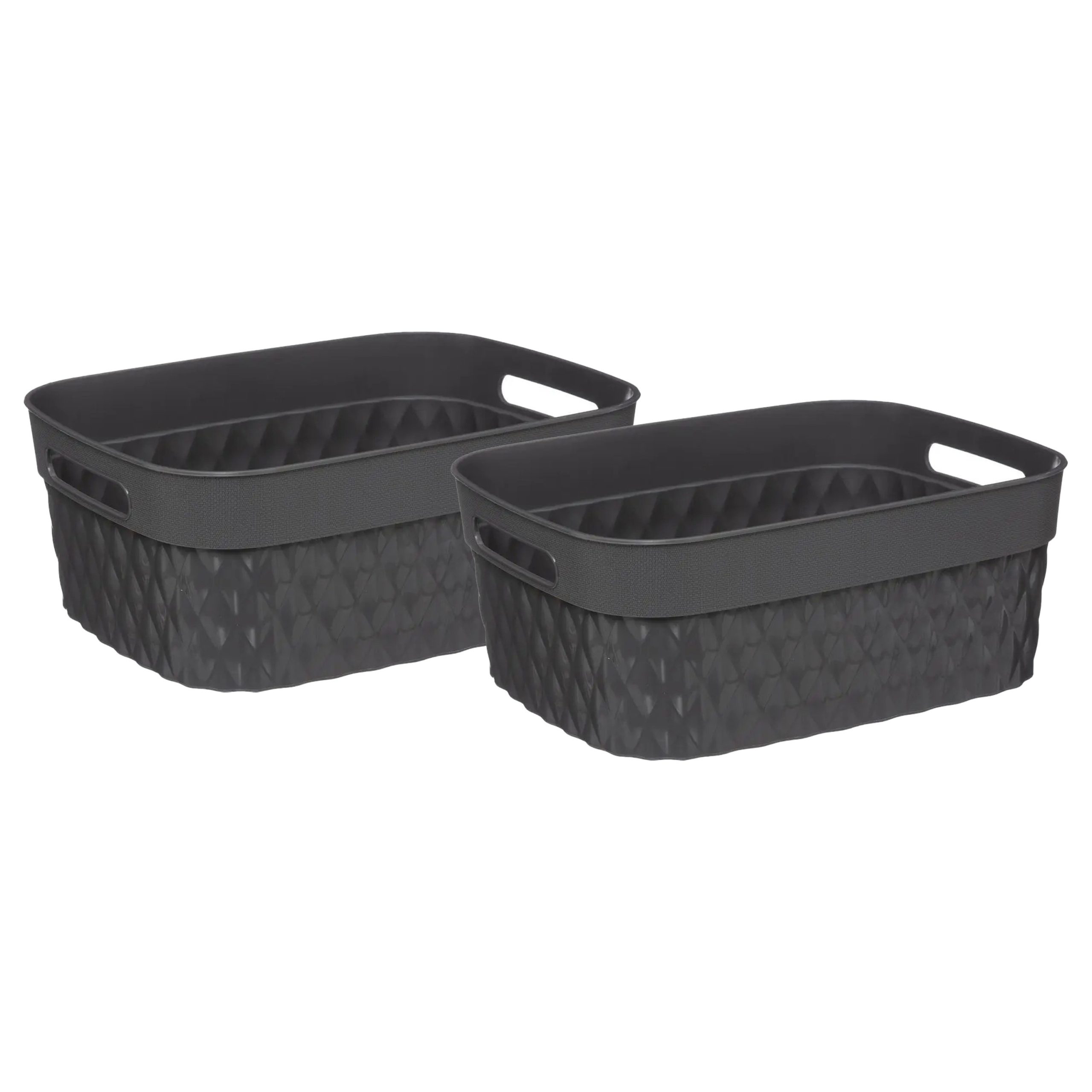 2x stuks Opbergmand kunststof rechthoek in het grijs. Deze opbergbox/doos/mand is een kast-organiser en is geschikt voor in de woonkamer, badkamer, keuken of slaapkamer om bijvoorbeeld speelgoed, kantoor spullen of sokken in op te ruimen. Deze mand beschikt over een geweven relief en handvatten. Afmeting: 24,8 x 33 x 12,8 cm. Inhoud: 8,5 liter. Materiaal: polyethyleen.
